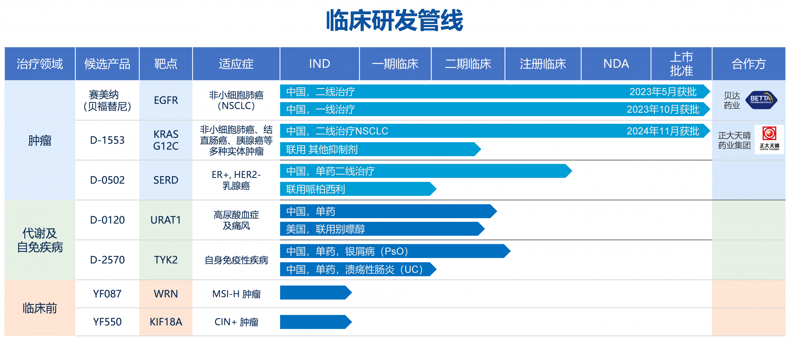千亿国际生物的产品主要聚焦于肿瘤、代谢及自身免疫性疾病等重大疾病领域,均为自主研发。截至目前,千亿国际生物的产品管线有2个获批上市新药产品,3个处于临床试验阶段的产品,临床开发的产品项目跨越一期到注册三期临床试验等多个阶段。同时,千亿国际生物依托独立的自主研发体系持续开发包括针对激酶、肿瘤驱动基因、肿瘤免疫、合成致死通路等一系列临床候选化合物,临床前研究管线布局丰富。